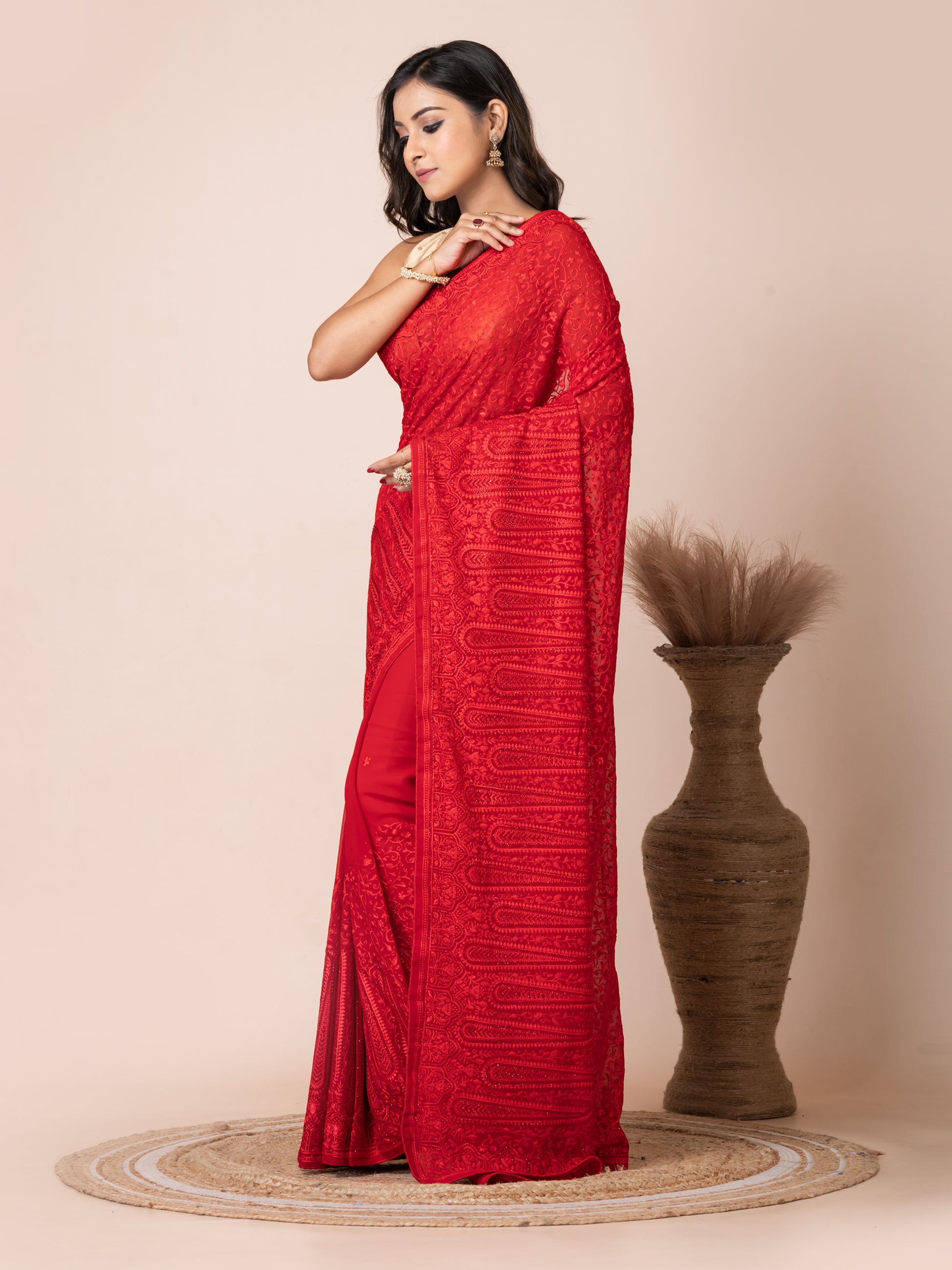 Make a striking impression with this vibrant Red Fancy Chiffon Saree, a stunning fusion of traditional craftsmanship and modern elegance. Crafted from lightweight, sheer chiffon, this saree drapes effortlessly, creating a flowy and graceful silhouette. The intricate jal work embroidery, featuring delicate paisley and floral motifs in shimmering threads, adorns the entire saree, adding a mesmerizing charm. The border is enhanced with detailed embroidery, lending a regal touch to this luxurious piece. Paired with a matching blouse, this saree is perfect for weddings, festive occasions, or any event where you want to stand out with timeless beauty.