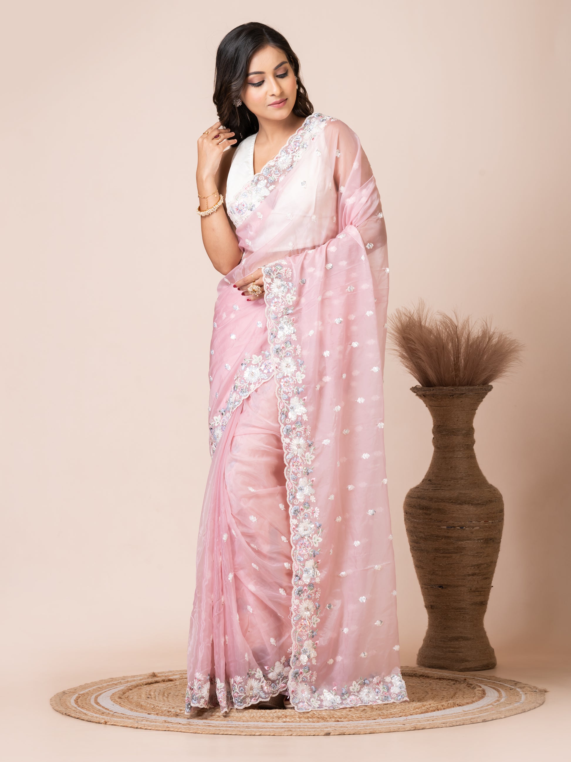 Charming Peach Organza Tissue Saree with Floral Embroidery