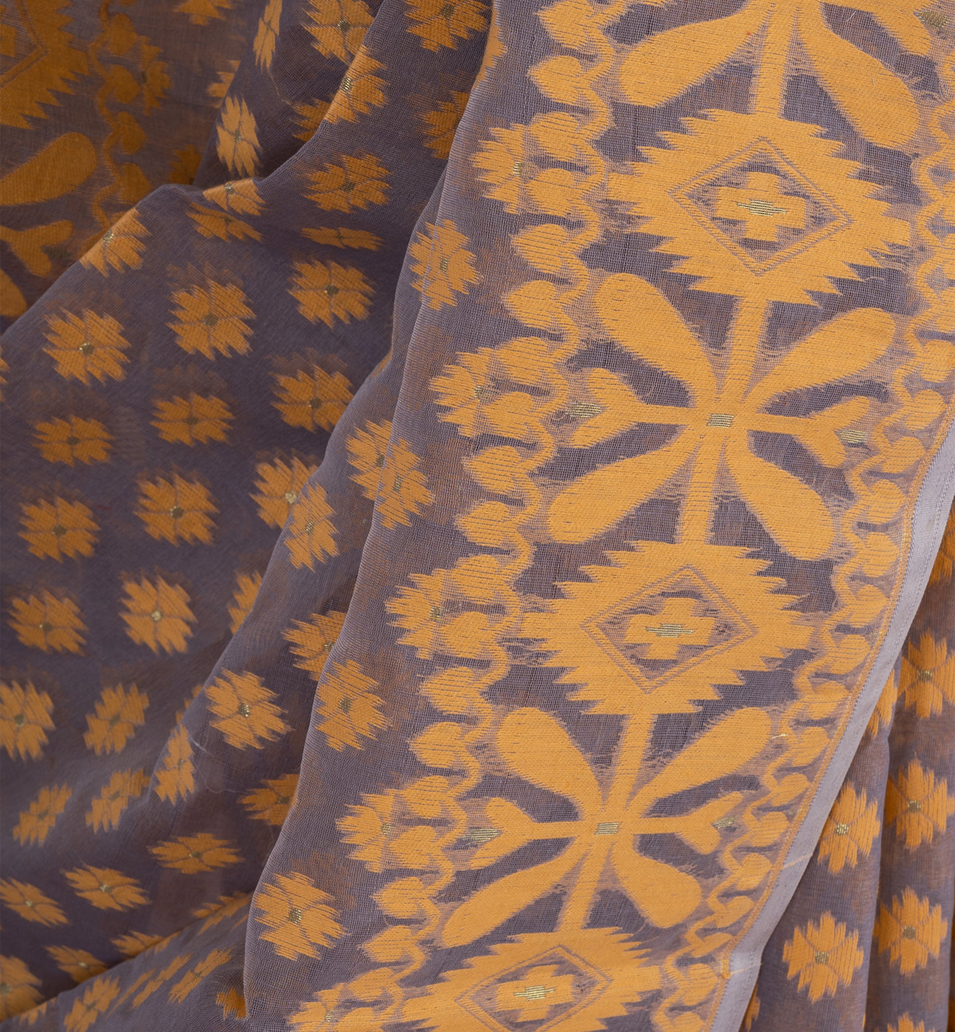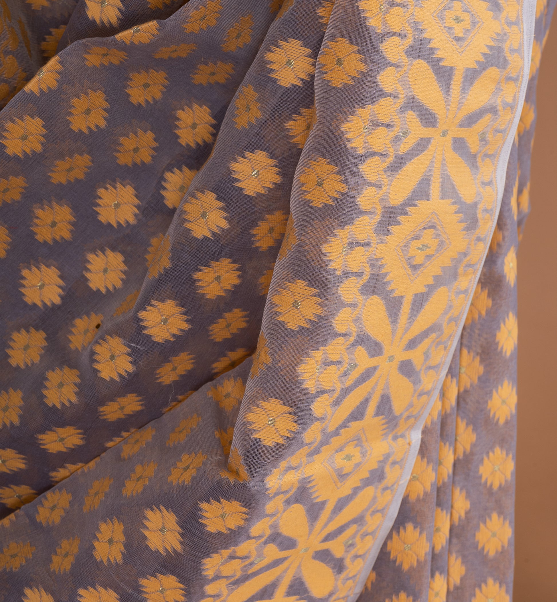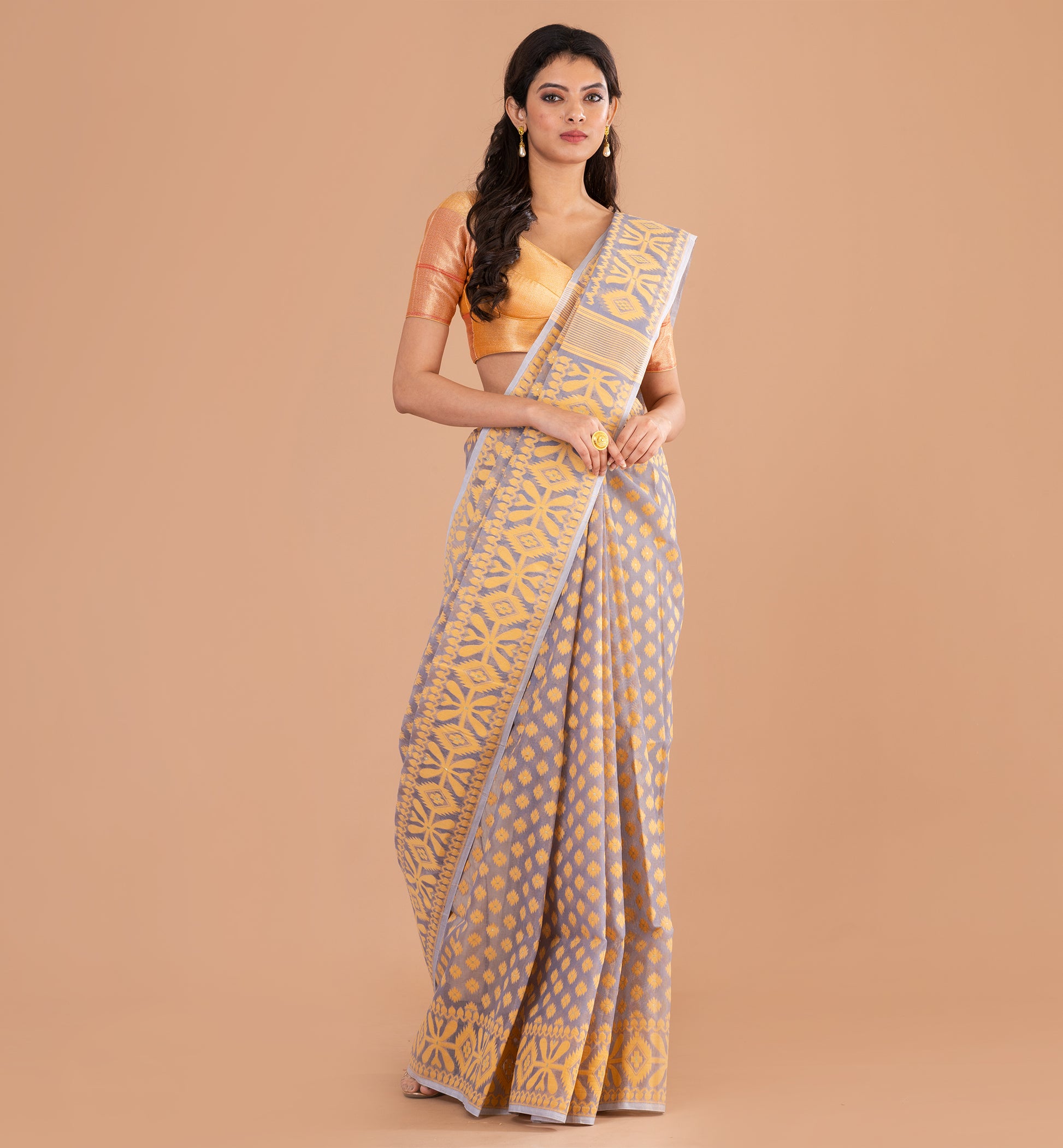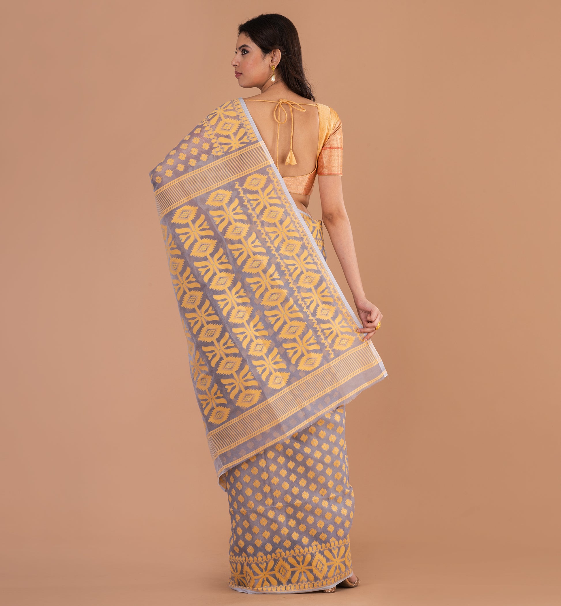 Embrace the pinnacle of refined luxury with this handwoven Grey Jamdani Cotton Saree, a testament to the artistry of traditional craftsmanship. Crafted from the finest cotton, this saree features exquisite Jamdani motifs in golden hues that weave a narrative of heritage and sophistication. Its airy texture ensures unmatched comfort, while the intricate patterns and borders elevate it to a symbol of timeless elegance, ideal for the connoisseur of haute couture. Designed without a blouse piece, it offers a versatile canvas for bespoke styling, allowing you to create a look of unparalleled grace and individuality.