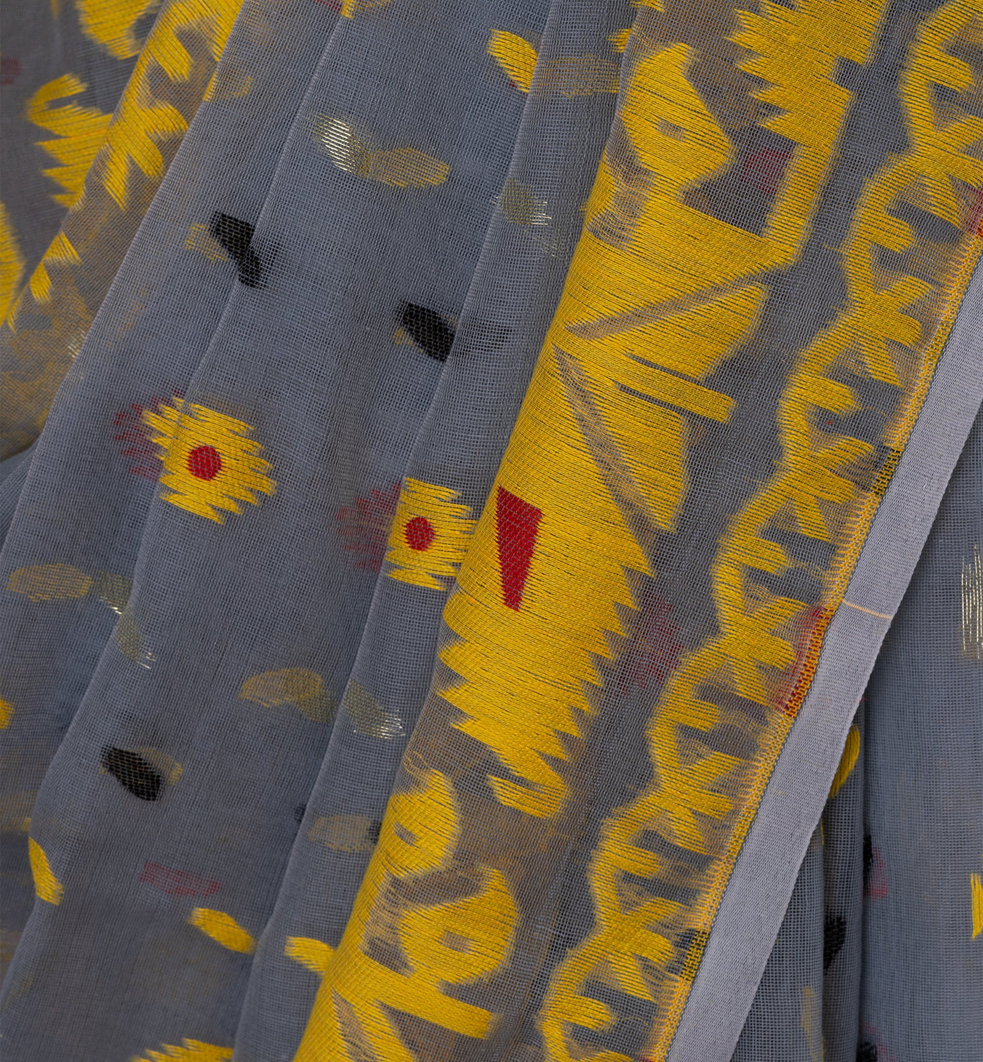 Step into a world of refined luxury with this handwoven Grey Tant Jamdani Cotton Saree, a masterpiece that blends the delicate artistry of Tant weaving with the intricate charm of Jamdani craftsmanship. Crafted from the finest cotton, this saree features exquisite motifs and a vibrant yellow border, showcasing a harmonious balance of tradition and elegance. Its lightweight, breathable fabric ensures exceptional comfort, making it a perfect choice for festive occasions or sophisticated gatherings. Designed without a blouse piece, it offers a versatile canvas for personalized styling, allowing you to craft a look of timeless grace and individuality.