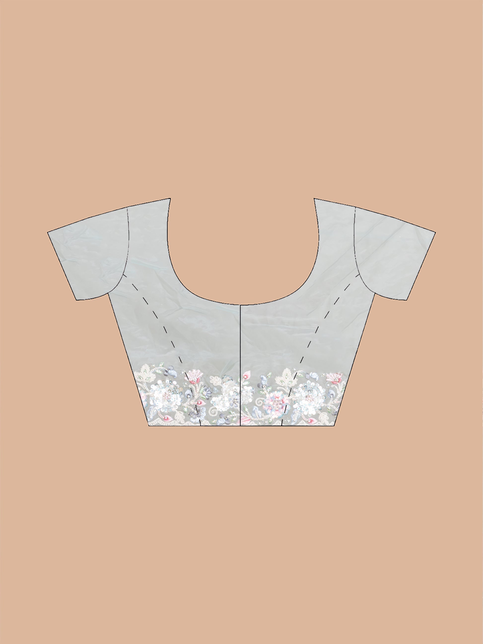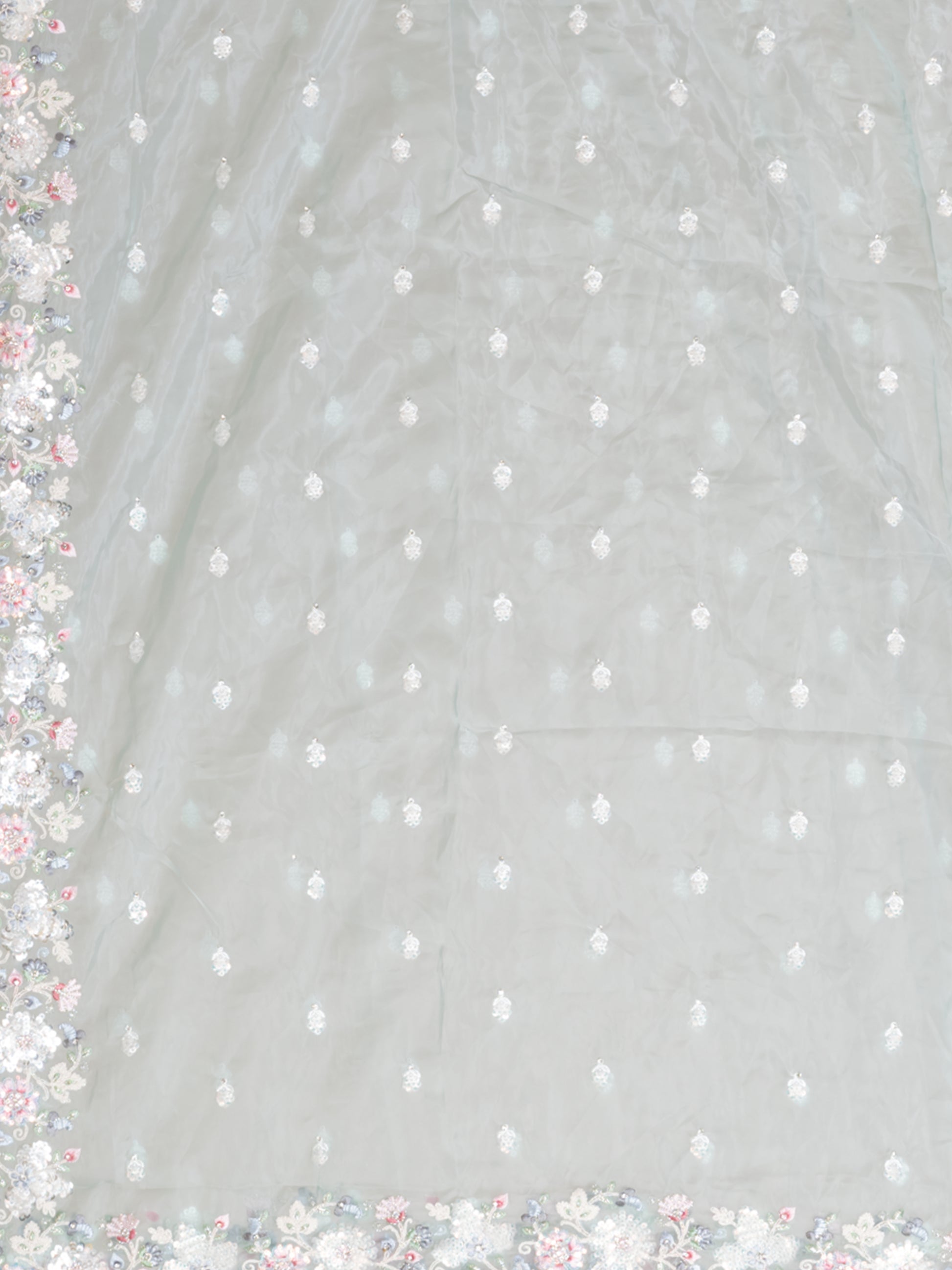 Step into ethereal beauty with this exquisite Mint Green Organza Tissue Saree, a perfect blend of tradition and modern elegance. Crafted from luxurious organza tissue fabric, this saree offers a lightweight, sheer texture with a subtle sheen, draping gracefully for a dreamy silhouette. The saree is adorned with delicate floral embroidery in soft pastel shades, scattered across the body, while the border features intricate floral patterns with shimmering sequins, adding a touch of glamour. Paired with a matching blouse, this saree is ideal for weddings, festive occasions, or any event where you want to exude timeless charm.