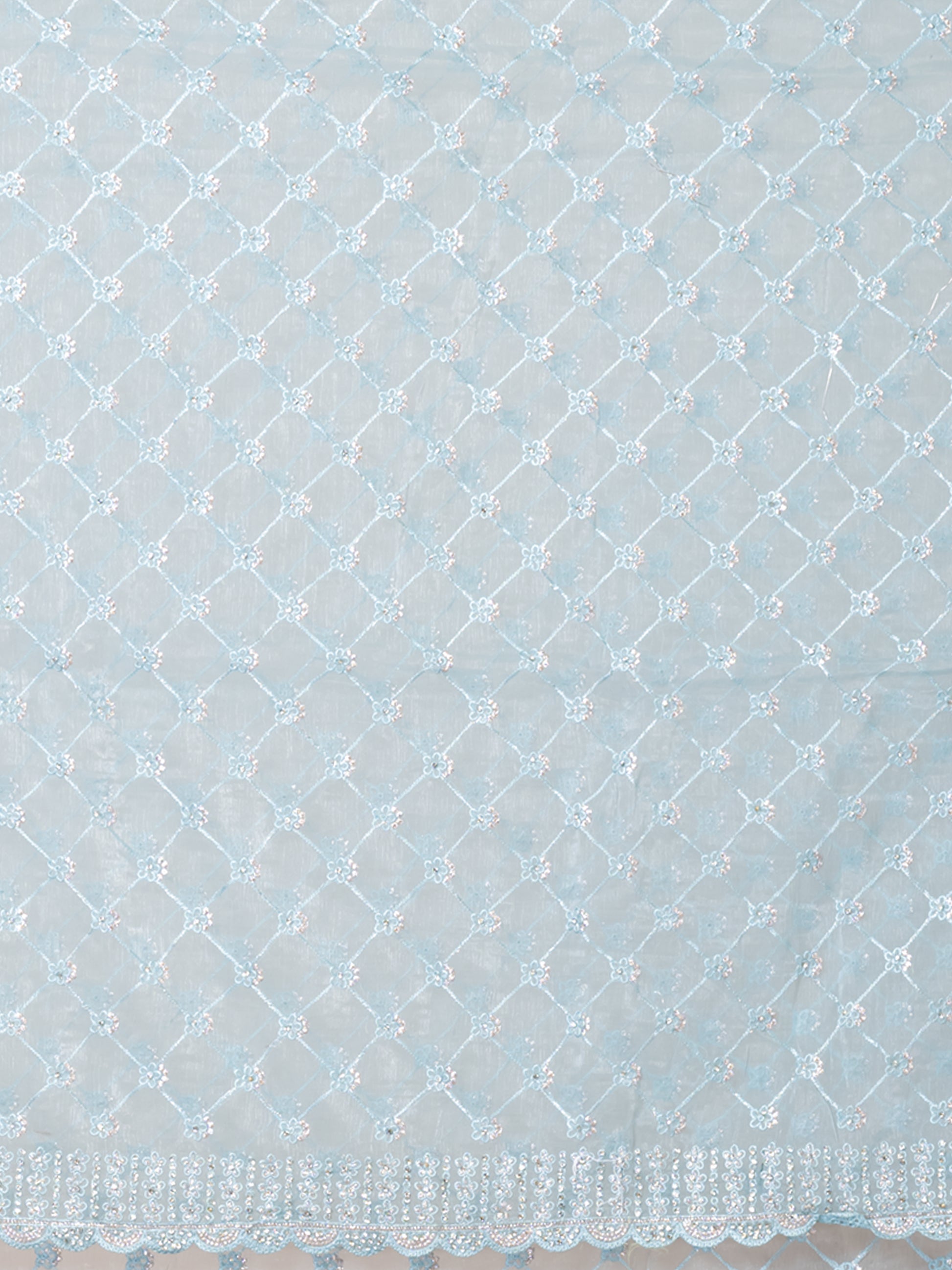 Embrace timeless grace with this exquisite Sky Blue Net Saree, a perfect fusion of tradition and modern elegance. Made from lightweight, sheer net fabric, this saree drapes effortlessly, giving you a delicate and ethereal appearance. The intricate white embroidery across the body forms a subtle geometric pattern, while the scalloped border, adorned with shimmering sequins, adds a touch of sophistication. Paired with a matching blouse, this saree is an ideal choice for festive occasions, weddings, or any special event where you want to shine with understated charm.