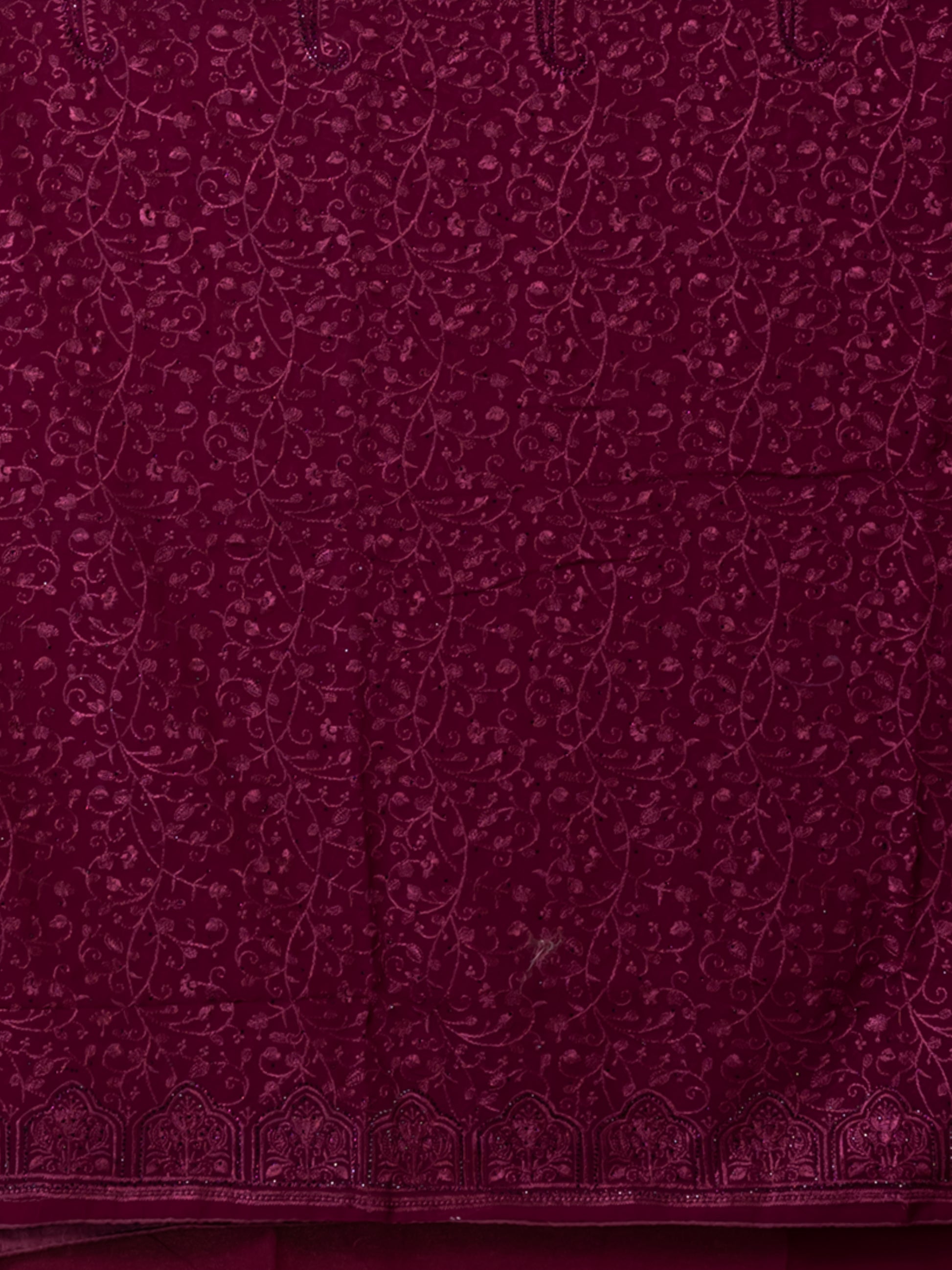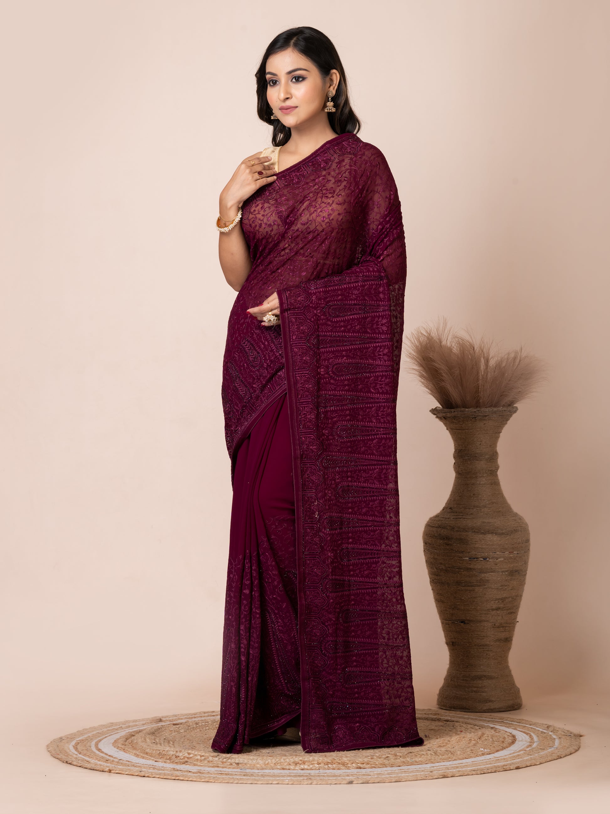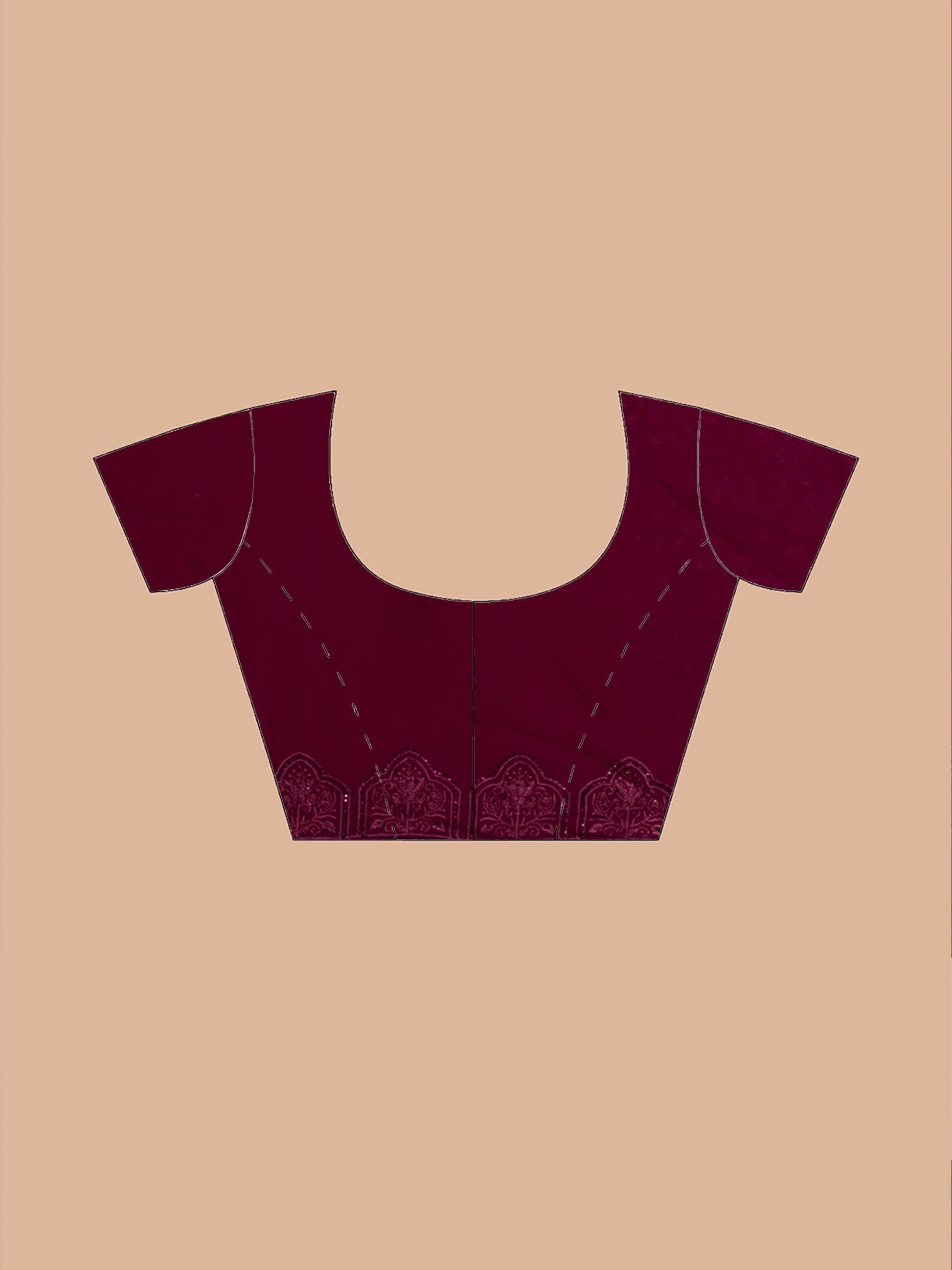 Radiate elegance with this stunning Maroon (Wine) Fancy Chiffon Saree, a perfect blend of traditional artistry and modern sophistication. Crafted from lightweight, sheer chiffon, this saree drapes effortlessly, creating a flowy and graceful silhouette. The intricate jal work embroidery, showcasing delicate paisley and floral motifs in shimmering threads, adorns the entire saree, lending it a mesmerizing charm. The border features detailed embroidery, adding a regal touch to this luxurious piece. Paired with a matching blouse, this saree is ideal for weddings, festive occasions, or any event where you want to leave a lasting impression.