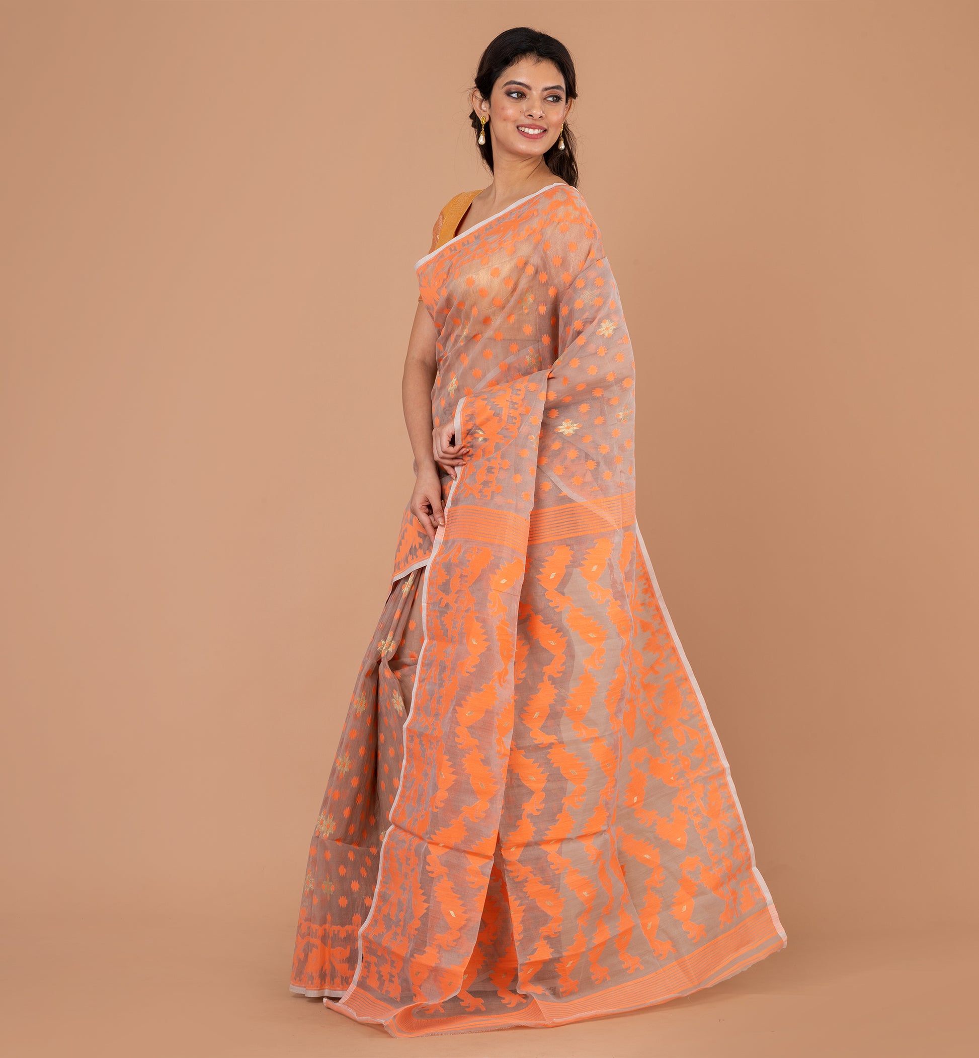 Indulge in the refined luxury of this handwoven Orange Jamdani Cotton Silk Saree, a masterpiece that marries the ethereal beauty of Jamdani craftsmanship with the opulent texture of cotton and silk. Each thread tells a story of meticulous artistry, featuring intricate motifs that dance across the fabric, complemented by a striking border that exudes grandeur. This lightweight yet lavish saree offers a perfect blend of comfort and elegance, ideal for the modern aristocrat seeking to make a statement. Designed without a blouse piece, it invites personalized styling to reflect your unique regal flair.