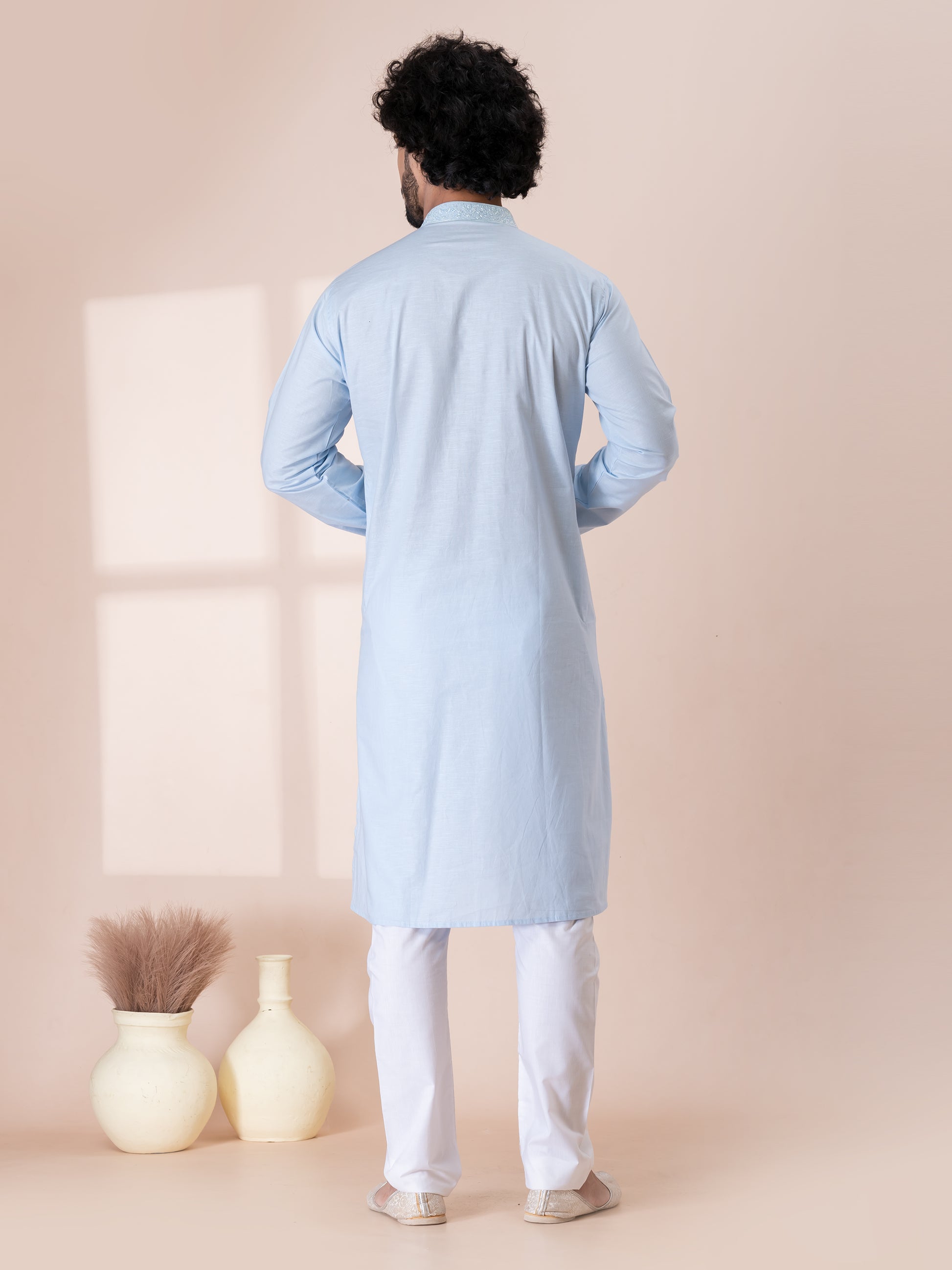 Flawless Weathered Blue Handloom Cotton Kurta Pajama Set with Neck Handwork