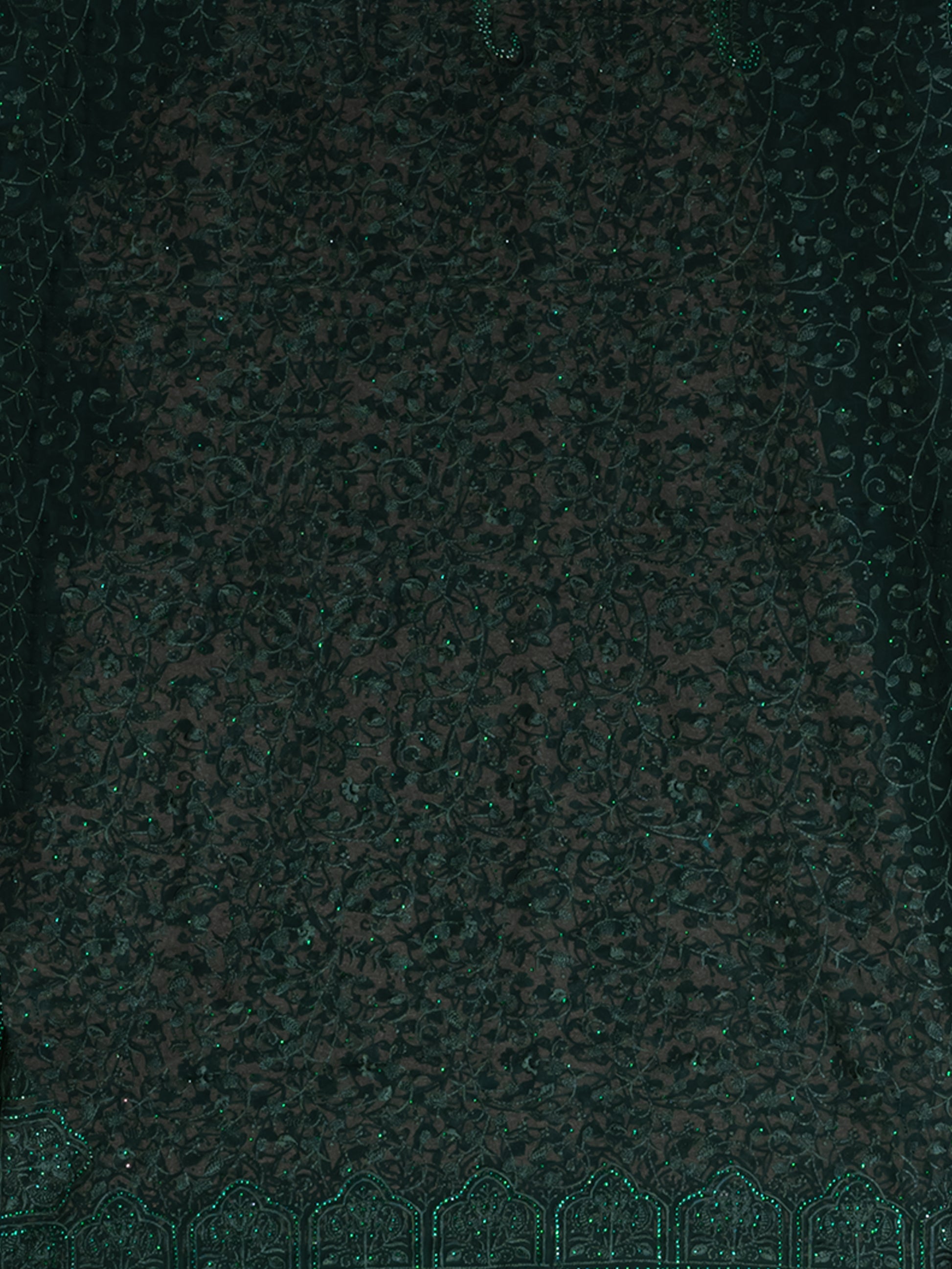 Step into elegance with this breathtaking Dark Green Fancy Chiffon Saree, a masterpiece of traditional craftsmanship and modern allure. Crafted from lightweight, sheer chiffon, this saree drapes beautifully, offering a flowy and ethereal look. The intricate jal work embroidery, featuring delicate paisley and floral patterns in shimmering threads, adorns the entire saree, creating a mesmerizing effect. The border is accentuated with detailed embroidery, adding a regal touch to this stunning piece. Paired with a matching blouse, this saree is perfect for weddings, festive occasions, or any event where you want to make a lasting impression.