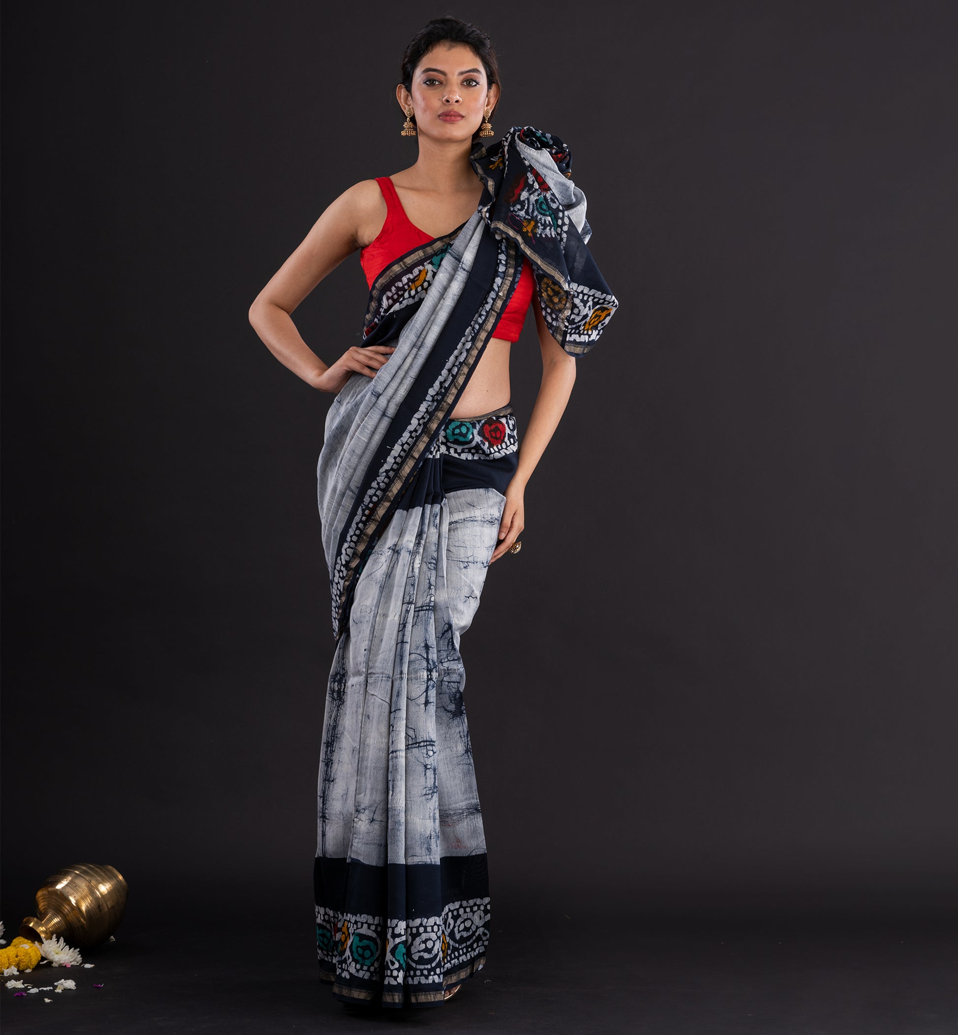 Monochrome Batik Cotton Saree with Tribal-Inspired Border