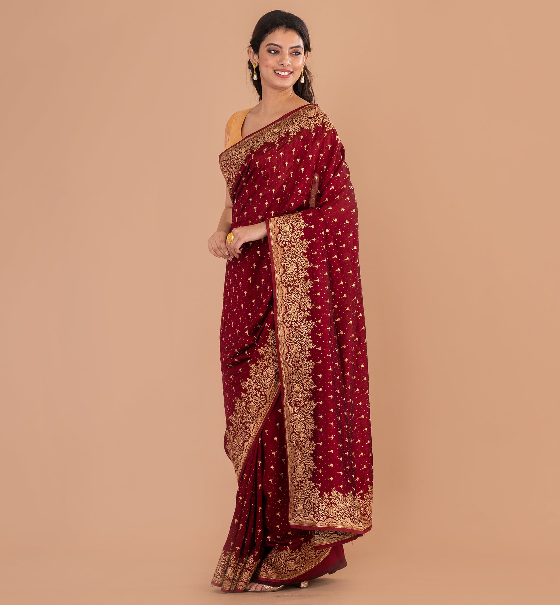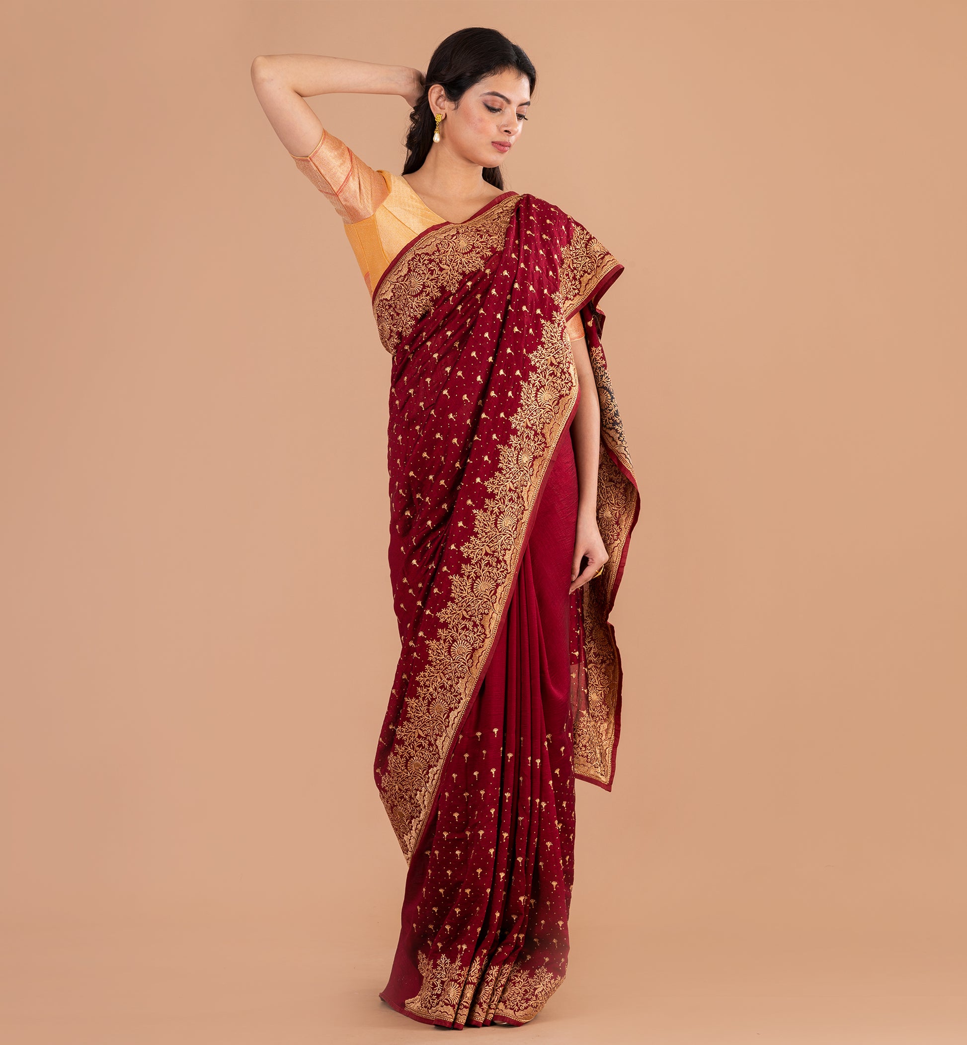 Pair with a gold silk blouse to accentuate the zari, and adorn with statement jewelry and a clutch. Drape the pallu elegantly to highlight the embroidery for a majestic appearance.