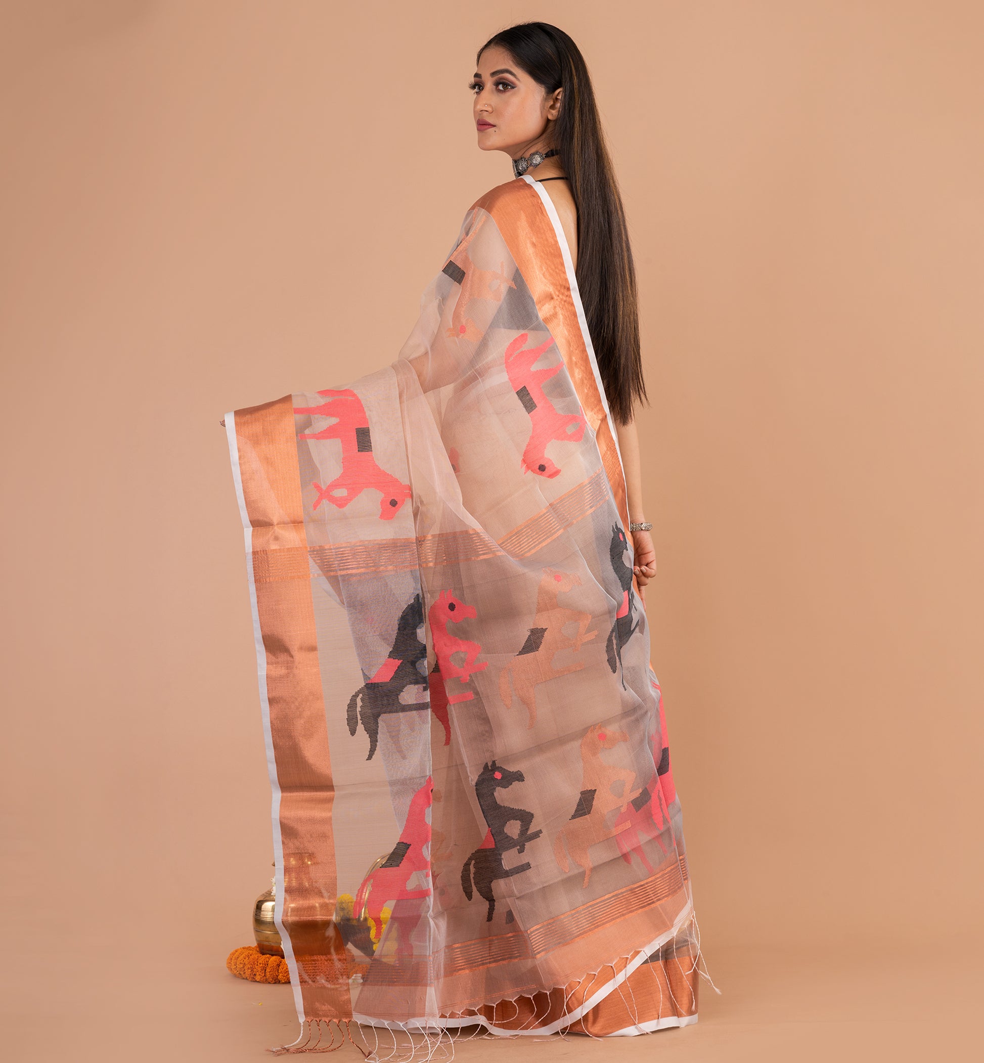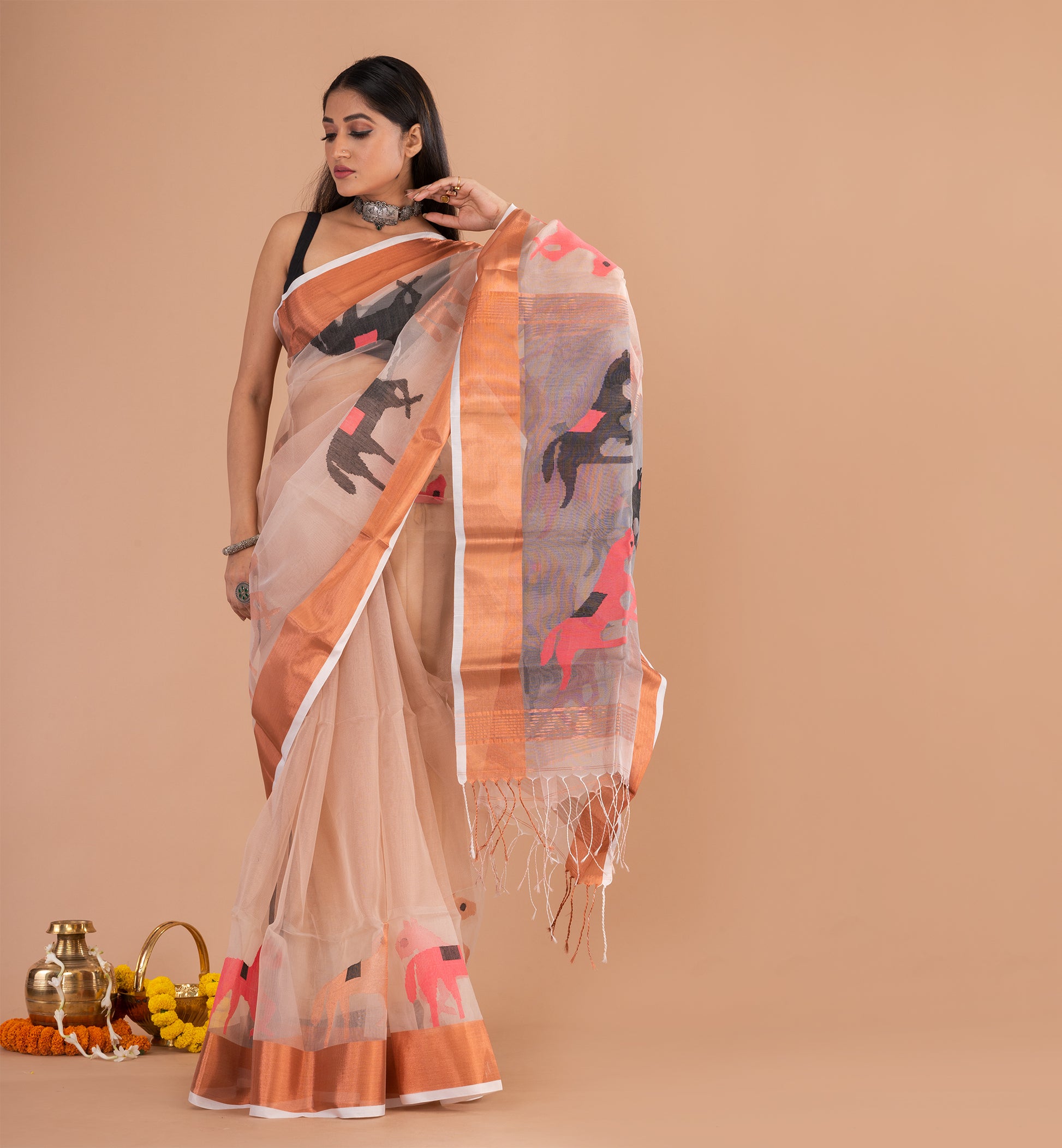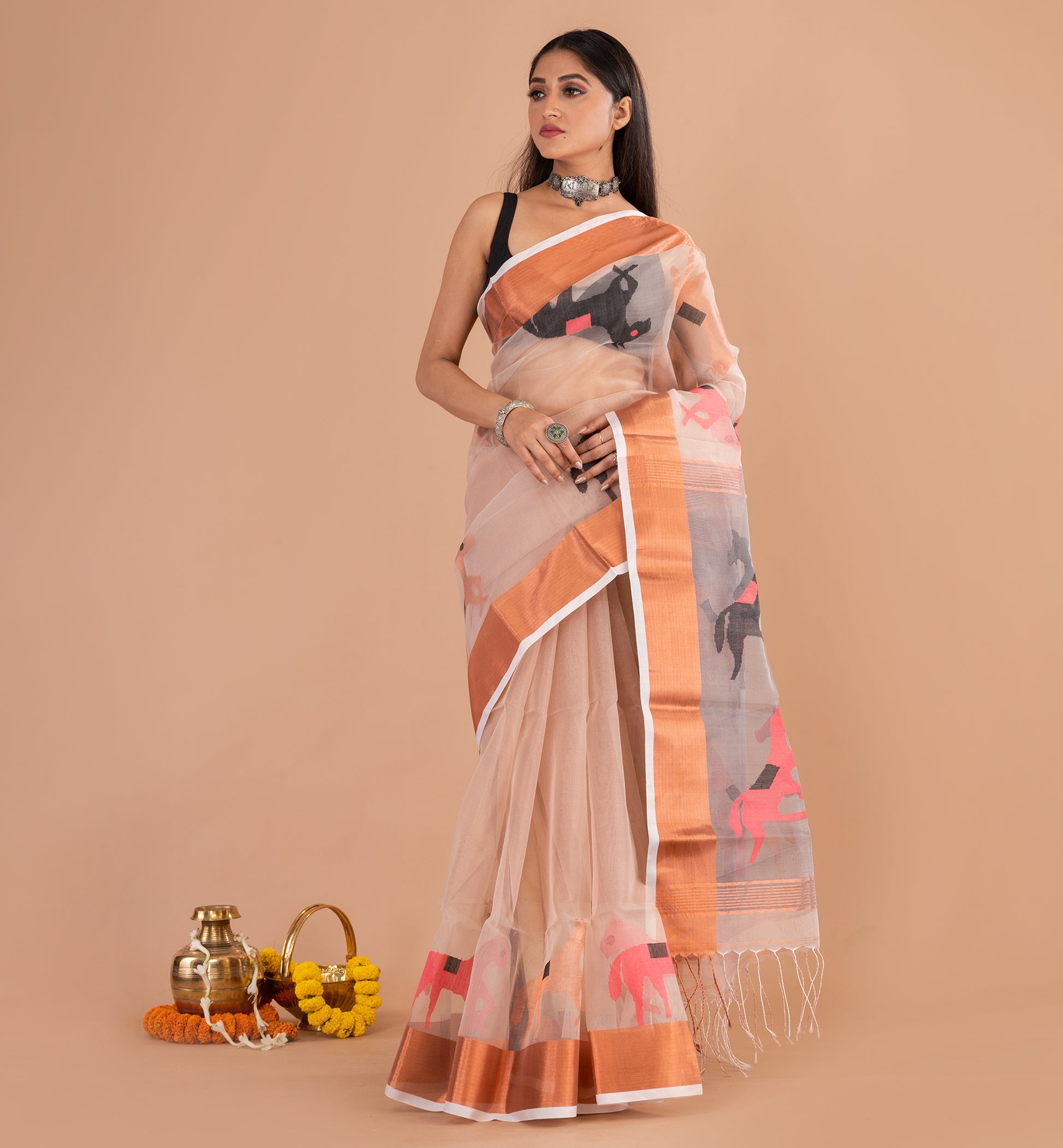 Elevate your elegance with this handcrafted Peach Boutique Cotton Organza Saree, a luxurious blend of delicate craftsmanship and ethereal charm. Woven from premium cotton organza, this saree features intricate horse motifs and a striking orange border, showcasing a perfect harmony of modern artistry and traditional finesse. Its sheer, lightweight fabric offers a breezy comfort while exuding an air of opulence, making it a standout choice for the discerning fashion enthusiast. Designed without a blouse piece, it provides a versatile canvas for personalized styling, inviting you to craft a look of unparalleled sophistication.