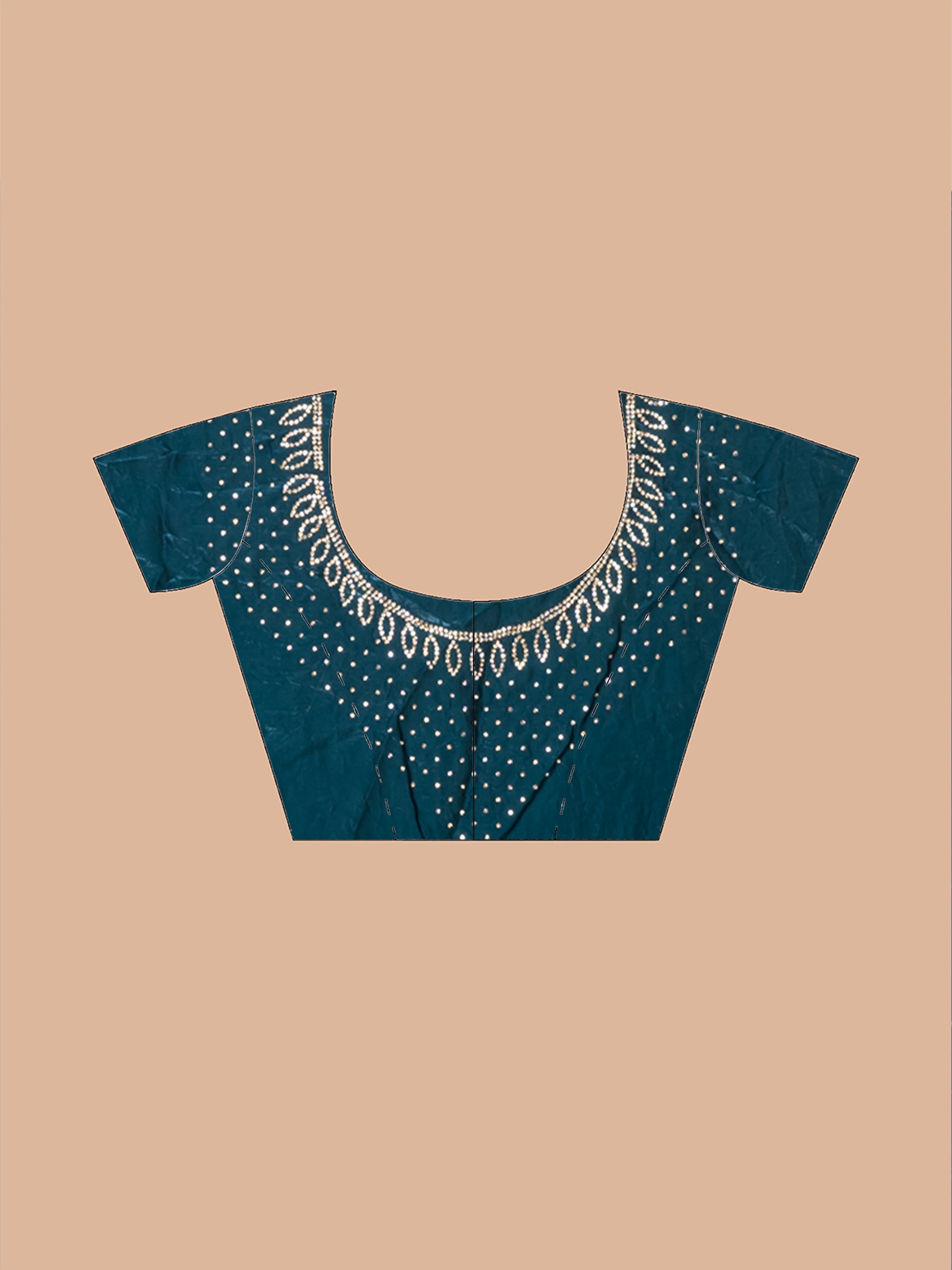 Pair this saree with silver or pearl jewelry, such as a delicate choker and drop earrings, to enhance its sophisticated charm. Style your hair in a sleek bun or soft waves to complement the saree’s elegant vibe. For a contemporary touch, add a metallic belt at the waist to define your silhouette. Complete the look with silver or gold heels and a matching clutch to create a polished ensemble that highlights the saree’s rich teal hue.
