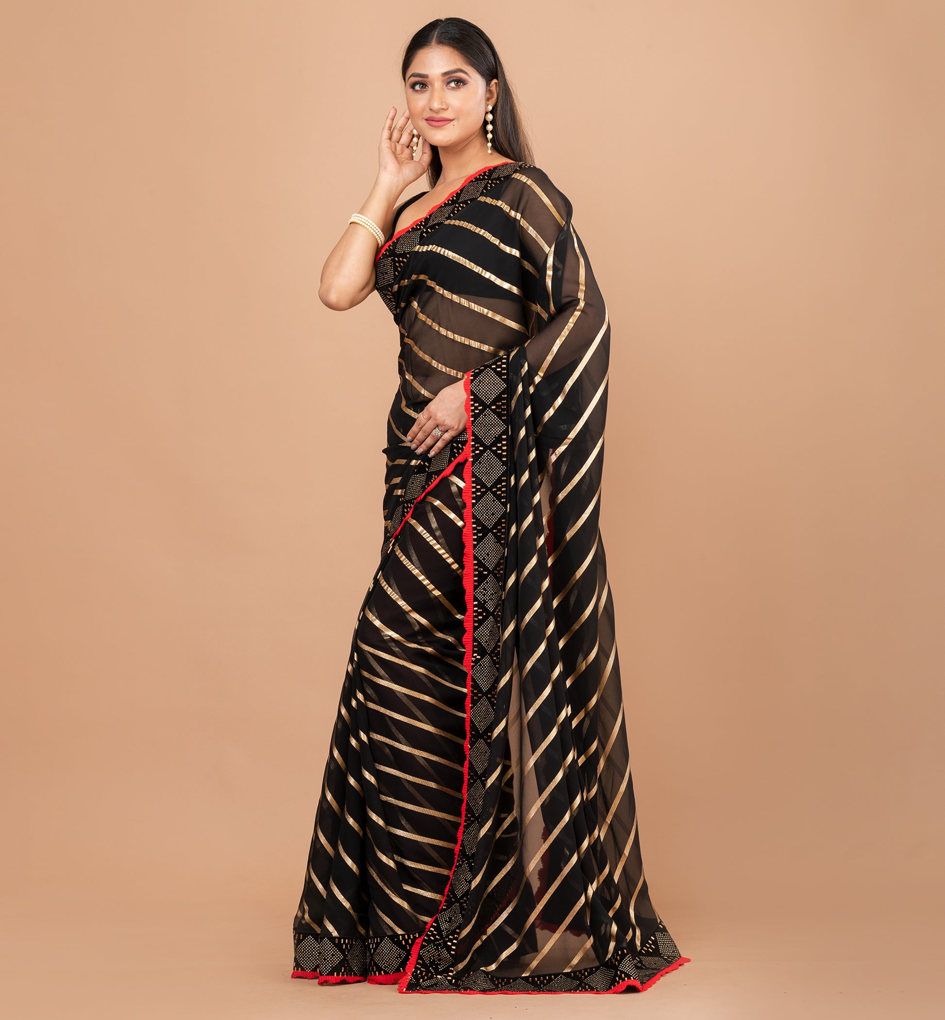 Indulge in the ethereal allure of this handcrafted Black Fancy Chiffon Saree, a luxurious embodiment of modern elegance and delicate craftsmanship. Woven from premium chiffon, this saree features bold gold stripes and intricate patterns, complemented by a vibrant red border that radiates sophistication. Its sheer, lightweight fabric offers a breezy comfort, making it an exquisite choice for festive celebrations or upscale gatherings. Designed without a blouse piece, it provides a versatile canvas for personalized styling, allowing you to craft a look of stunning individuality and refined glamour.